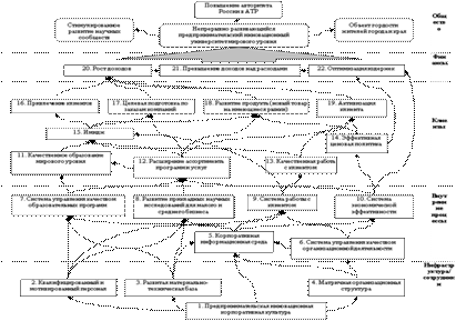 Существуют и другие наборы перспектив, отражающие специфику деятельности организации. Отметим, что для государственных и некоммерческих организаций рекомендуется перспективу «Клиенты» перемещать вверх по иерархии. При постановке ССП, например, во ВГУЭС была добавлена к четырем классическим перспективам Каплана и Нортона пятая перспектива «Общество», цели в которой являются проекцией миссии ВГУЭС на ценность, которую составляет университет для широкой общественности [16]. Карта целей ВГУЭС представлена на рис. 13.