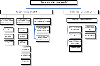 Методики анализа БП делятся на два вида: качественный и количественный. Методики качественного анализа, в свою очередь, состоят из анализа субъективных оценок БП сотрудниками организации и внешними специалистами, визуального анализа графических схем БП и сравнения БП с установленными требованиями. Существует несколько методик субъективной оценки БП. Остановимся на некоторых из них.