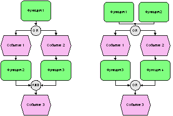 | Событие может произойти либо после завершения выполнения Функции 1, либо после завершения выполнения Функции 2, либо после завершения выполнения и Функции 1, и Функции 2. Функция может начать выполняться либо после того, как произойдет Событие 1, либо после того, как произойдет Событие 2, либо после того, как произойдут оба события: Событие 1, и Событие 2 | |