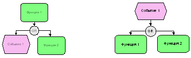 | Оператор «ИЛИ» используется для обозначения слияния/ветвления функций и для слияния событий. По правилам нотации EPC после одиночного события не может следовать разветвляющий оператор «ИЛИ». Завершение выполнения Функции может инициировать 3 вида ситуаций: только Событие 1; только Событие 2; одновременно и Событие 1, и Событие 2 |