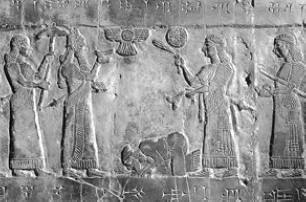 Владыка Ассирии принимает дань от царя Израиля [Рельеф из дворца в Кальху. IX в. до н. э. ]
