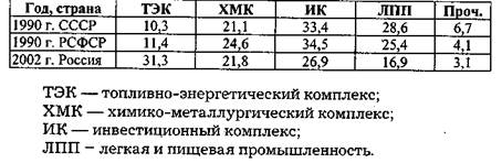 В 1990 г. за счет топливно-энергетического комплекса структура промышленности России была "тяжелее" общесоюзной. В 2002 г. при сокращении удельного веса других отраслей (инвестиционного комплекса, легкой и пищевой промышленности, проч.) в топливно-энергетическое комплексе она выросла почти в три раза, т. е. еще весьма значительно "утяжелилась".