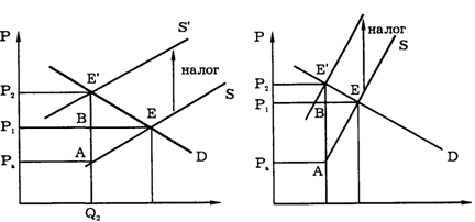 В случае эластичного спроса большая часть налога выплачивается производителем, в случае неэластичного спроса — потребителем (сравним разделение отрезка АЕ' на АВ и BE' в первом случае и во втором на рис. 3.25).