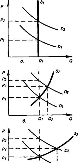Предположим, спрос на какой-либо товар вырос. Поскольку предложение этого товара сразу возрасти не сможет, ситуация мгновенного равновесия будет характеризоваться лишь повышением цены (ряс. 8-а). Кривая предложения Si представляет собой вертикальную линию с нулевой эластичностью, и сдвиг кривой спроса в положение D2 увеличивает цену равновесия до Рз.
