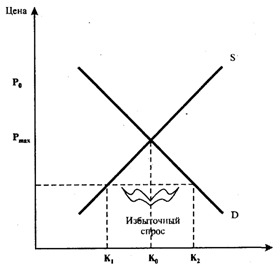 В »развитых странах мира правительства различными способами регулируют рынки: через механизм налогообложения, предоставление субсидий, установление контроля за ценами и др. Рассмотрим изменения в рыночном механизме при установлении государством максимальной цены, более низкой, чем цена равновесия. Например, правительство США в 1974-1975 гг., когда выросли мировые цены на нефть, на внутреннем рынке установило более низкую цену (рис. 10).