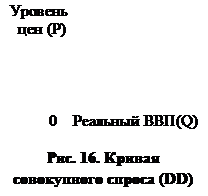 Кривая совокупного спроса (DD) показывает количество товаров и услуг, которое потребители готовы приобрести при соответствующем уровне цен (рис. 16). Она дает такие варианты сочетания объема производства товаров и услуг и общего уровня цен в экономике, при которых товарный и денежный рынки находятся в равновесии.