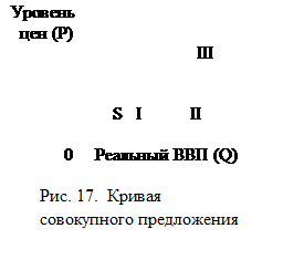 Кривая совокупного предложения показывает, какой объем совокупного выпуска может быть предложен на рынок производителями при определенных значениях общего уровня цен в экономике. Форма кривой совокупного предложения интерпретируется по-разному: классической и кейнсианской школами. Отрезок I характеризует предложение в условиях неполной занятости, отрезок III определяет совокупное предложение в состоянии полной занятости, а отрезок II характерен для предложения в условиях, приближающихся к полной занятости.