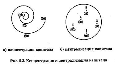 Концентрация капитала — рост размеров капитала за счет капитализации части прибыли на уровне одного производственного звена. В примере (см. рис. 5.3. а) предприятие "А" за ряд циклов увеличивает размеры капитала с 1000 млн. до 2000 млн. руб.