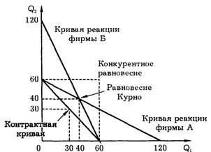 Равновесие Курно достигается, когда Q1= Q2 = 40, а суммарный выпуск составляет 80 единиц. Если фирмы договорятся максимизировать совокупную прибыль, чтобы затем разделить ее пополам, то множество возможных решений этой задачи будет ложиться на контрактную кривую. При этом суммарный выпуск Q1 + Q2 = 60.