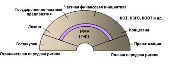 Не случайно государственно-частное партнерство обычно изображается его сторонниками как средство реагирования на финансовую жесткость правительства и как средство, альтернативное вложениям государственного капитала в инфраструктуру и иные дорогостоящие проекты. Для частного сектора государственно-частное партнерство позиционируется как форма эффективной реализации своих инвестиционных проектов. Частному сектору государственно-частное партнерство дает очевидные выгоды в виде получения существенных доходов, нового ценного управленческого и хозяйственно-экономического опыта, развития и привлечения технологических инноваций.Приводимая ниже схема (рис. 2)[489] иллюстрирует место государственно-частного партнерства, включая различные формы его реализации, в сравнении с приватизацией в диапазоне рисков для бизнеса.