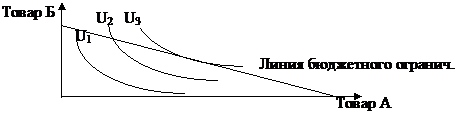 Графическое изображение различных комбинаций двух экономических благ, имеющих одинаковую полезность для потребителя, называется кривой безразличия (U). Множество кривых безразличия одного потребителя образуют карту безразличия. При этом чем правее и выше расположена кривая безразличия, тем большее удовлетворение приносят представленные ею комбинации двух благ. В свою очередь линия бюджетного ограничения информирует о наиболее выгодном наборе продуктов для потребителя, уравнение которой можно записать следующим образом: I = P1 Q1 + P2 Q2, где I – доход потребителя; P1; P2 – цена товаров А и Б; Q1; Q2 – количество товаров А и Б.