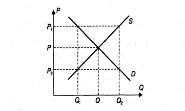 Аналогичная картина создастся, если цена окажется ниже развесной, т.е. будет равна Р2. Несовпадение интересов продавцов и покупателей выразится в возникновении дефицита товара и объеме Q 1–Q 2. Желающие купить недоступный товар будут переплачивать до тех пор, пока цена не поднимется до уровня цены равновесия Р.
