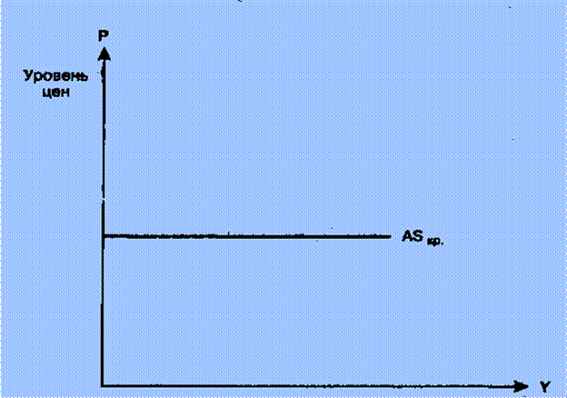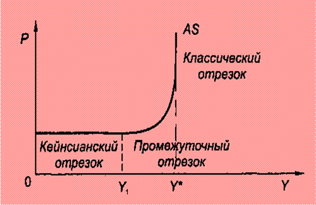 Горизонтальный, или кейнсианский, отрезок отражает депрессивное состояние экономики с неполным использованием всех ресурсов (существуют не задействованные в процессе производства мощности, сырье, рабочая сила).