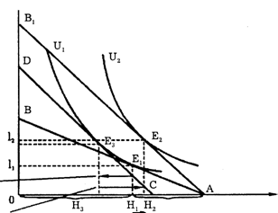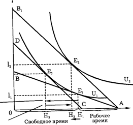 Если мы проведем бюджетное ограничение CD, параллельное АВ1, и касающееся кривой безразличия U1 то сумеем определить эффекты замещения и дохода. Эффект замещения выражается в сокращении свободного времени и росте заработной платы. Графически это означает перемещение из Н1 в Н3.