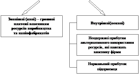 Існує два підходи до визначення витрат: бухгалтерський і економічний. Поняття бухгалтерських і економічних витрат пов'язане з зовнішніми і внутрішніми витратами. Зовнішні (явні) витрати – це витрати підприємства на придбання ресурсів у зовнішніх постачальників. Внутрішні (неявні) витрати можна визначити як вартість факторів виробництва, що знаходяться у власності господаря підприємства.
