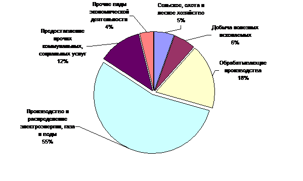 Из общего объема загрязненных сточных вод, сбрасываемых в водные объекты России, 55% приходится на предприятия по производству и распределению электроэнергии, газа и воды, 18% – на обрабатывающие производства, 12% – на предприятия жилищно-коммунального хозяйства (рис. 1-3).