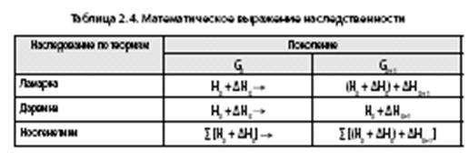 Математические выражения наследственности генотипом и разумом предложены в табл. 2.4., где G — поколение; х — номер предыдущего поколения; х+1 — номер последующего поколения; Н — информация о структурно-функциональных особенностях, наследуемая индивидуумом; ∆Н — полезная информация, полученная индивидуумом в течение жизни; ∑ — совокупность структурно-функциональных особенностей интеллектуальной системы.