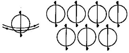 Однако, если в вакууме появляется объект с вращением, как это изображено на рис.4, тогда те объекты, ось вращения которых совпадает с этой осью, сохраняют то же вращение, а объекты, ось вращения которых была первоначально ориентированна в противоположную сторону, под действием спинирующего объекта испытывают инверсию, и их оси вращения меняется.