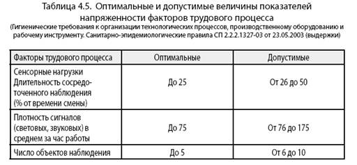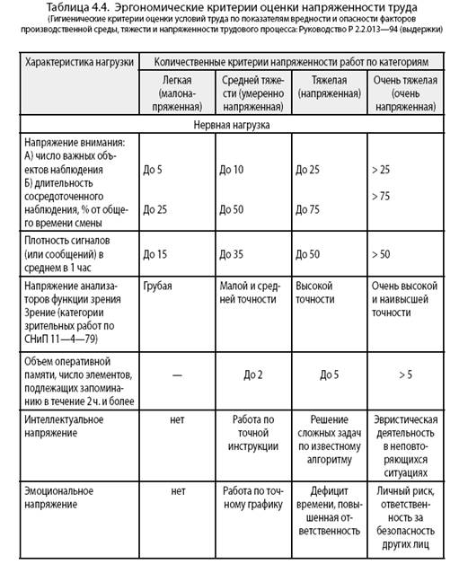 С развитием гигиенической науки Госкомсанэпиднадзором России были утверждены (1986,1994, 2003гг.) гигиенические нормативы напряженности работ по интеллектуальному и эмоциональному напряжению, некоторые из которых связаны с информацией и приведены в таблицах 4.3—4.5: «плотность сигналов (или сообщений) в единицу времени», «разборчивость сигналов в %»; к «количественным критериям категории напряженных работ» относятся «решение сложных задач по известному алгоритму», «повышенная ответственность», а к «количественным критериям очень напряженных работ» — «эвристическая деятельность в неповторяющихся ситуациях», «личный риск, ответственность за безопасность других лиц».