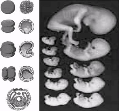 Рис. 3.10. …начиная с бластулы, совокупность делящихся клеток и их геномов, при помощи информационного параметрического управления, влияет на образование формы рук, ног, головы...: дробление яйцеклетки; закладка осевого комплекса органов; развитие зародыша и интеллектуальной системы человека