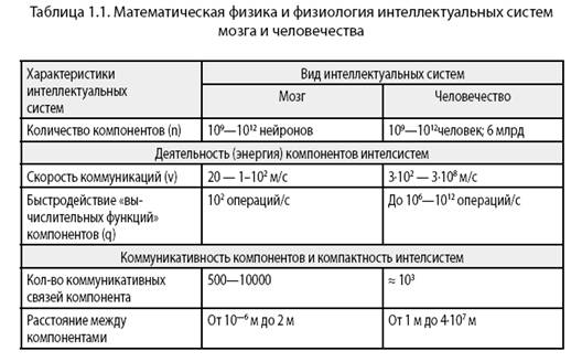 Быстродействие нейрона известно (102 операций в секунду), но мозга человека как «компонента человечества» не определено. Между тем, известно быстродействие созданных человеком средств связи и обработки информации у микропроцессоров ЭВМ — 106 — 1012 операций в секунду (Г. Р. Иваницкий, 1991). Правда, количество быстродействующих ЭВМ и масштаб их использования несравнимо меньше количества нейронов в мозге или людей на Земле. Скорость зрительных и звуковых коммуникаций между людьми с помощью и без специальных средств связи находится в диапазоне 3?102 — 3?108 м/с (от скорости звука до скорости распространения электромагнитных волн, электротока, света).