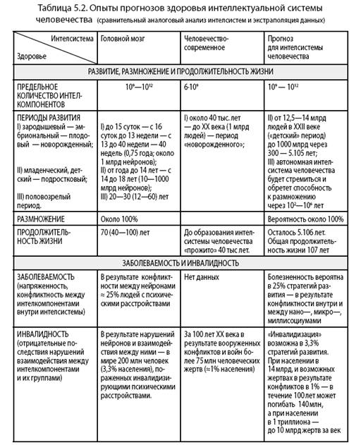 Из прогнозов здоровья интеллектуальной системы человечества сгруппированных в таблице (табл. 5.2.) ясно, что: время созревания — наступит через 100—500000 лет; заболеваемость — вероятность 25%; инвалидиза-ция — в 3% случаев стратегий развития; смертность — 100%; продолжительности жизни — 10 млн лет; вероятность размножения — около 100%; время размножения — наступит через 100 лет — 1 млн лет.