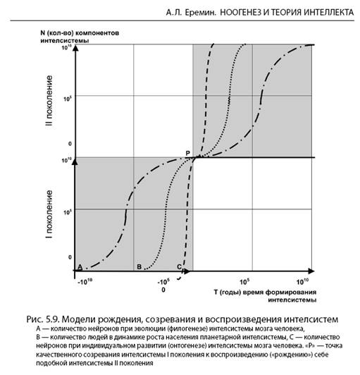При накоплении интеллектуальных компонентов — людей ≥109, формирования автономной интелсистемы человечества, из модели В на рис. 5.9. прогнозируется готовность в точке Р для зарождения, размножения второго поколения интелсистемы человечества.