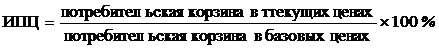 Представив условную корзину из трех групп товаров, определим цены потребительской корзины в текущем и базовом периодах и, соотнеся их, получим индекс потребительских цен.
