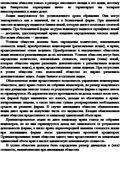 Акции не выпускаются государственными органами, они эмитируются промышленными, торговыми и финансовыми корпорациями. Образованный капитал при ликвидации корпорации подлежит возмещению во вторую очередь после выплаты обязательств, представленных в заемном капитале. Акционеры отвечают по обя-