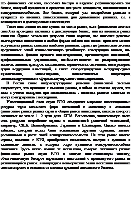Таким образом, традиционный депозитный и процентный банковский бизнес, широко распространенный в Российской Федерации, в условиях глобализации мировой экономики не способен без ресурсов мирового фондового рынка даже при совершенствовании своих технологий обслуживания и привлечения клиентов увеличивать капитализацию и доход, достаточные для прямых долгосрочных инвестиций в реальную экономику России с целью повышения ее конкурентоспособности на внешнем рынке.