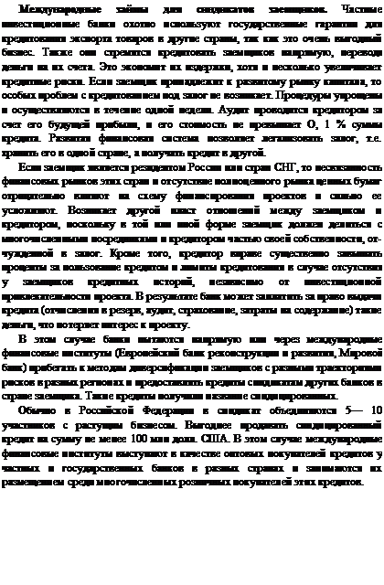 Чем больше связаны финансовые рынки стран, чем активнее действуют крупные игроки — кастодиальные банки, тем меньше процентные ставки таких кредитов. Часто к синдицированным кредитам кастодиальных банков прибегают и международные финансовые институты, работающие на рынке Российской Федерации. В лучшем случае процентные ставки кастодиальных банков не превышают ставокЛИБОР (2—3% годовых). Следовательно, первоочередной задачей при привлечении таких заимствований является создание условий розничной торговли кредитами, при которых ставки возрастали незначительно, а для этого нужны соответствующие инфраструктурные решения кастодиальных технологий. Здесь мы подходим к проблеме заимствований «кредитор— заемщик», которая требует постоянного переосмысления с развитием банковских технологий. Она решается по-разному разными типами банков, использующих разные типы финансовых рынков, в экономике с разными макроэкономическими показателями. Поэтому нельзя однозначно определить, какую схему кредитования заемщика следует применять в том или ином случае. Однако существуют определенные принципы, единые для всех схем: достаточность и прозрачность капитала заемщика, понимание сути перспективности его бизнеса и границы увеличения дохода при использовании заемных средств, ликвидность залога, а также объективность организационных, финансовых и экономических показателей.Значительная часть российского бизнеса не отвечает этим требованиям, что оборачивается повышенными требованиями к доле валютной выручки в долларах США, время организации таких программ увеличивается до двух — четырех месяцев, устанавливаются жесткие лимиты и сроки возврата долга, высокие (8—10%) ставки и издержки (1,5— 2% объема кредитов), что составляет стартовые затраты в 100— 150 тыс.долл. США.