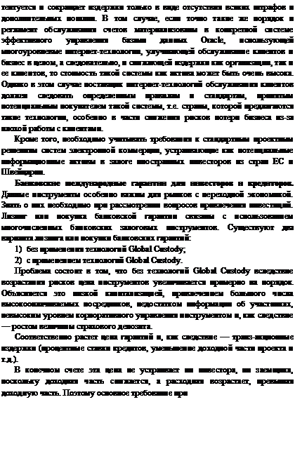 Ту же самую функцию выполняют многочисленные кастоди-альные банки, более жестко привязанные к фондовым рынкам мира с разными траекториями цен на инвестиции и ценные бумаги. В этом смысле они в качестве оптовых покупателей не только денег, но и большого числа фондовых инструментов, обладают более крупными финансовыми ресурсами, нежели международные финансовые институты и могут позволить себе существенное снижение стоимости ресурсов для конечных покупателей на развивающихся рынках.