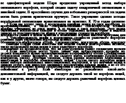 В 1964 г. появляются три работы, открывшие следующий этап в инвестиционной теории, связанный с так называемой моделью оценки капитальных активов, или САРМ (Capital Asset Price Model). Допустим, все инвесторы, обладая одной и той же информацией, одинаково оценивают доходность и риск отдельных акций. Допустим также, что все они формируют свои оптимальные в смысле теории Марковица портфели акций исходя из индивидуальной склонности к риску. Как в этом случае сложатся цены на рынке акций ? Таким образом, на САРМ можно смотреть как на макроэкономическое обобщение теории Марковица. Основным результатом САРМ явилось установление соотношения между доходностью и риском актива для равновесного рынка. При этом важным оказывается тот факт, что при выборе оптимального портфеля инвестор должен учитывать не весь риск, связанный с активом (риск по Марковицу), а только часть его, называемую систематическим, или недиверсифицируемым, риском. Эта часть риска актива тесно связана с общим риском рынка в целом и количественно представляется коэффициентом «бета», введенным Шарпом в его однофактор-ной модели. Остальная часть (так называемый несистематический, или диверсифицируемый, риск) устраняется выбором соответствующего (оптимального) портфеля. Характер связи между доходностью и риском имеет вид линейной зависимости, поэтому обычное практическое правило «большая доходность — значит большой риск» получает точное аналитическое представление.