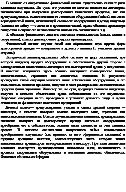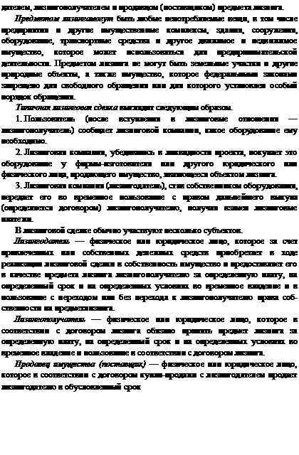 Под лизингом обычно понимают инвестирование временно свободных или привлеченных финансовых средств, при котором лизингодатель обязуется приобрести в собственность обусловленное договором имущество у определенного продавца и предоставить это имущество лизингополучателю за плату во временное пользование с правом последующего выкупа.