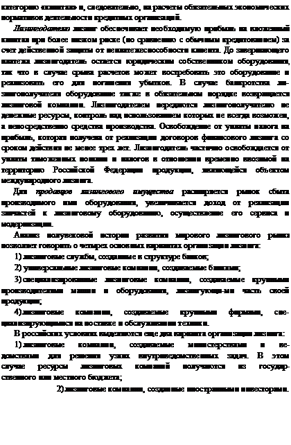 Лизинг становится гибким и многообещающим экономическим рычагом, способным привлечь инвестиции, способствовать подъему отечественного производства, привлечь капитал в жизненно важные отрасли экономики страны, обеспечить реальную поддержку малому бизнесу, обеспечить долгосрочный и надежный доход для коммерческих банков и т.п.