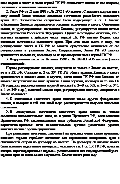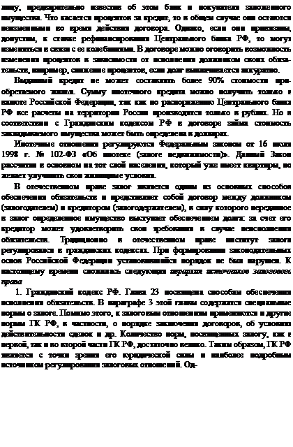 Ипотечное кредитование. Ипотека представляет собой более надежную форму гарантии (в отличие от индивидуальной — поручительства) погашения ссуды под недвижимое имущество, владелец которого не лишен права распоряжения им; ипотека дает кредитору право в случае неуплаты долга в срок исполнения обязательства взыскать и продать собственность заемщика. Ипотека с экономической точки зрения представляет собой рыночный инструмент оборота имущественных прав на объекты недвижимости в случаях, когда другие формы отчуждения (купля-продажа, обмен) юридически или коммерчески нецелесообразны, позволяющий привлечь дополнительные финансовые средства для реализации различных проектов. Ипотека— это высоконадежная форма гарантии погашения ссуды, так как кредитор в случае неуплаты долга в установленный срок вправе обратить взыскание на заложенное имущество1.