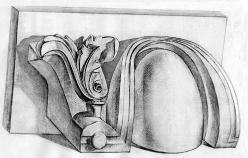 Что касается второго вида ионической капители, то в обучении рисунку используемая только ее часть. Конструктивную основу элементов капители образует отсеченная цилиндрическая форма ствола колонны, четырехугольный плинт (абака) и орнаментированный иониками вал (эхин), с двух сторон замыкаемый валютами (спералевидный завиток) (рис. 4.15). В рисунке форма капители еще больше усложнена наклоном.