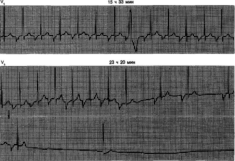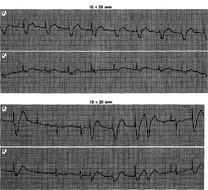 Рис. 1.35. Типичные фрагменты записи, полученной при холтеровском мониторировании у больной с имплантированным предсердным водителем ритма и жалобами на повторяющиеся обморочные приступы.