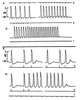 Препарат увеличивает длительность потенциала действия и вызывает нарастание потенциала при ранней постдеполяризации. После продолжительного диастолического периода (на фрагменте А) длительность потенциала действия существенно увеличивается и наблюдается всплеск ритмической активности при низком уровне мембранного потенциала. Потенциалы действия, вызванные ранней постдеполяризацией, обусловливают возникновение сложного ритма по типу бигеминии и тригеминии (фрагмент Б). На фрагменте В препарат стимулировался с короткими межимпульсными интервалами, что привело к сокращению длительности потенциала действия и исчезновению ранней постдеполяризации. Это показывает зависимость ранней постдеполяризации от брадикардии. S — моменты нанесения стимулов; Т — шкала времени с 1-секундными интервалами.