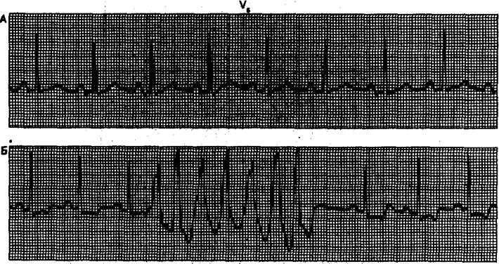 Рис. 1.21. Типичные фрагменты (А, Б) двухканальной записи, полученной при холтеровском мониторинге у больного с кардиомиопатией и приступами учащенного сердцебиения. Отмечаются частые полиморфные желудочковые экстравозбуждения, появляющиеся либо изолированно, либо в виде групп (до 3 экстрасистол подряд).