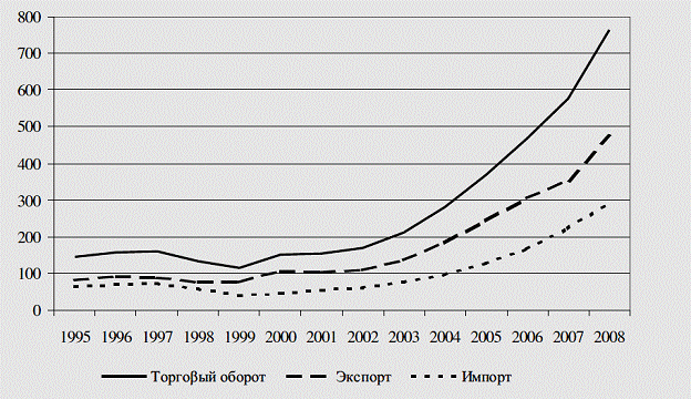 Рисунок 3- Объемы экспорта и импорта России, 1995-2008 гг. (млрд долл. США), источник:[4]