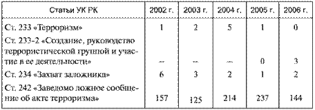 Динамика числа зарегистрированных преступлений террористического характера в Республике Казахстан за 2002–2006 гг.[262]