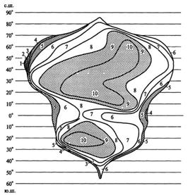 1–10 – пояса континентальности (пояснения в тексте). Штриховкой обозначены ландшафты с океаническим и морским климатом, точками – с резко и крайне континентальным климатом