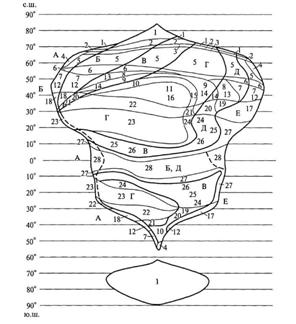 Рис. 4. Ландшафтные зоны и секторы на обобщённом континенте: 1–28 – ландшафтные зоны (пояснения в табл. 2); ландшафтные секторы: А – западный приокеанический; Б – западный переходный; В – типичной континентальный; Г – резко и крайне континентальный; Д – восточный переходный; Е – восточный приокеанический. Границы секторов обозначены утолщёнными линиями (пунктиром – приближённо), границы зон – тонкими