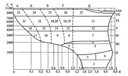 I – полярные; II – субполярные; III – бореальные; IV – суббореальные; V – предсубтропические; VI – субтропические; VII – тропические и субэкваториальные; VIII – экваториальные; ряды ландшафтных зон-аналогов по увлажнению: А – эстрааридные; Б – аридные; В – семиаридные; Г – сумигумидные; Д – гумидные; 1–28 – ландшафтные зоны (пояснения в табл. 2); Т – сумма температур за период со средними суточными температурами воздуха выше 100С; К – коэффициент увлажнения. Шкалы – логарифмические