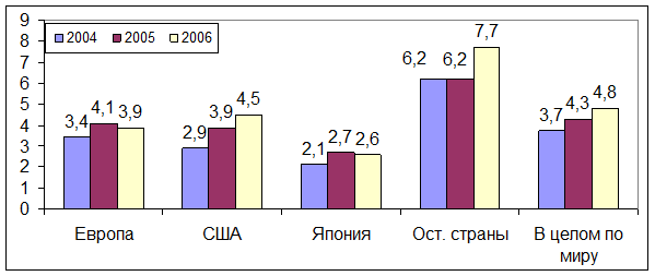Таблица - Показатели роста ИКТ-рынка в 2004-2006 гг.с делением по регионам, в %