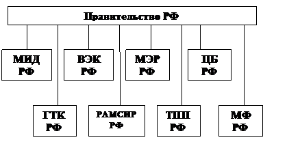 Общее руководство внешнеэкономическими связями осуществляет Правительство Российской Федерации. В качестве его постоянного органа функционирует Валютно-экономическая комиссия (ВЭК), которая рассматривает стратегические вопросы развития ВЭС, решает вопросы использования валютных средств, выдачи государственных гарантий под иностранные кредиты и т.д.Перспективные вопросы развития ВЭС, их роли в осуществлении структурной политики разрабатывает Министерство экономики РФ, которое является центральным органом исполнительной федеральной власти, осуществляющим государственную экономическую политику в области ВЭС: