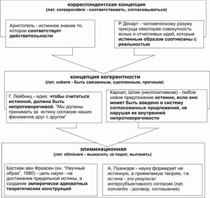 | Критерии когерентного понимания истины | логическая непротиворечивость (А. Пуанкаре), логическая возможность той или иной идеи (Г. Лейбниц), согласие фактов с данными опыта - верификация (неопозитивизм), опровергаемость научных теорий, метод фальсификации (постпозитивизм, К. Поппер) |
