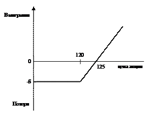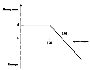Как показано на графике, инвестор получит прибыль, если курс акций к моменту истечения контракта превысит 125 руб., окончит сделку с нулевым результатом при курсе, равном 125 руб. и понесет потери, когда курс опустится ниже 125 руб. Следует обратить внимание на отрезок, заключенный в пределах от 120 руб. до 125 руб. При данном курсе акций инвестор исполнит опцион, чтобы уменьшить свои потери. Например, курс составил 123 руб. Прибыль от исполнения опциона равна: