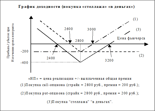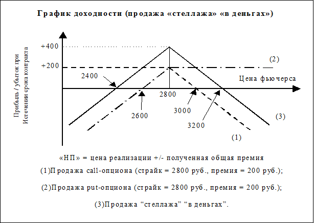 Пример 7.11. В октябре инвестор продает декабрьский 2800 руб. call-опцион на фьючерс с премией 200 руб. за контракт и продает декабрьский 2800 руб. put-опцион с премией 200 руб. за контракт. Общая полученная премия за “стеллажную” сделку составляет 400 руб.